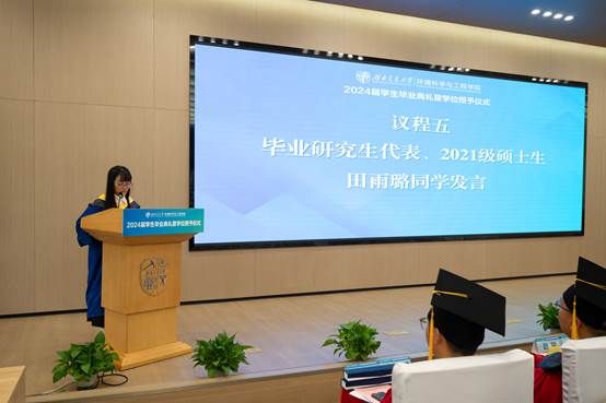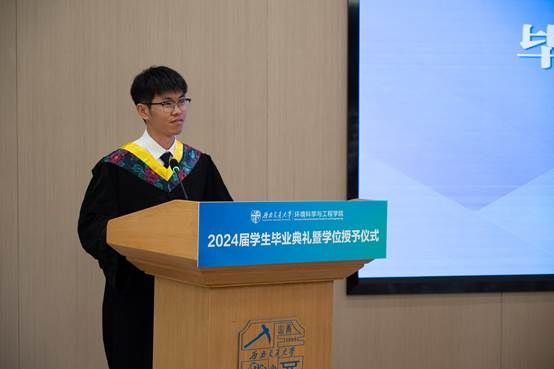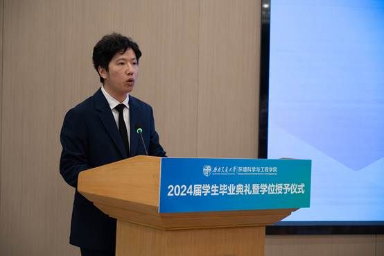 2021级硕士生田雨璐同学作为毕业研究生代表发言。毕业在即,田雨璐同学向辛勤培育的领导和老师表达了最真挚的感谢和敬意,并分享了三点感受:第一,盛行千里,不忘师恩。作为任课教师、班导师、硕士导师,龚老师是她学术和人生道路上的指明灯,激励着她在科研道路上不断奋进。田雨璐同学向龚老师及所有环境学科教师的辛勤付出,表达了深厚的敬意和感激。第二、反哺之情,寸草春晖。“正是父母无条件的爱和支持,才给予了我无限的底气去闯荡和探索世界”,希望今后也可以尽全力去看看他们未曾见到的世界。第三、谨记责任,不负韶华。田雨璐同学不忘交大的培养,并表示未来将接过环境保护的接力棒,用热爱和坚守推进美丽中国、生态文明建设,共同守护我们的家园。