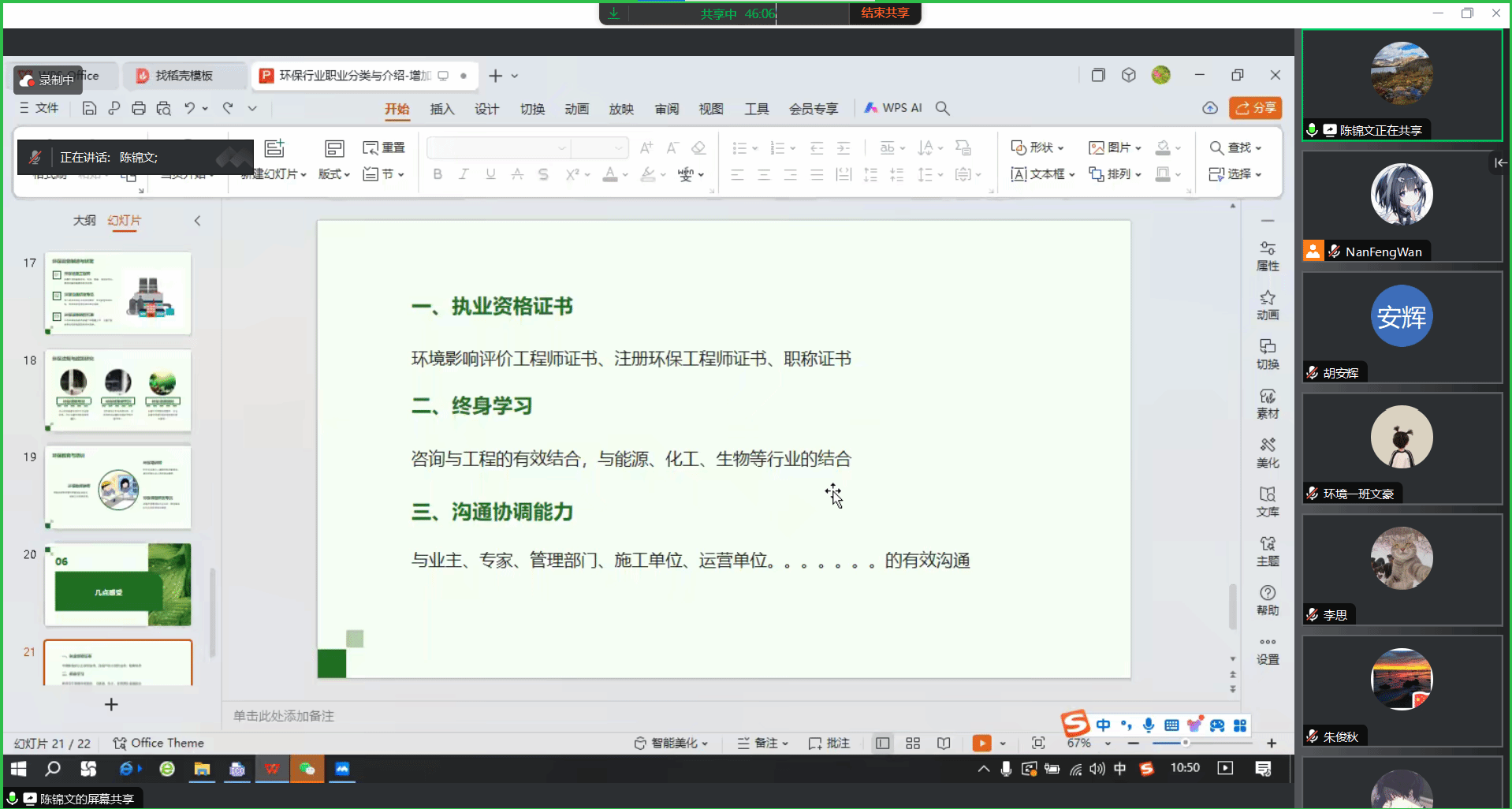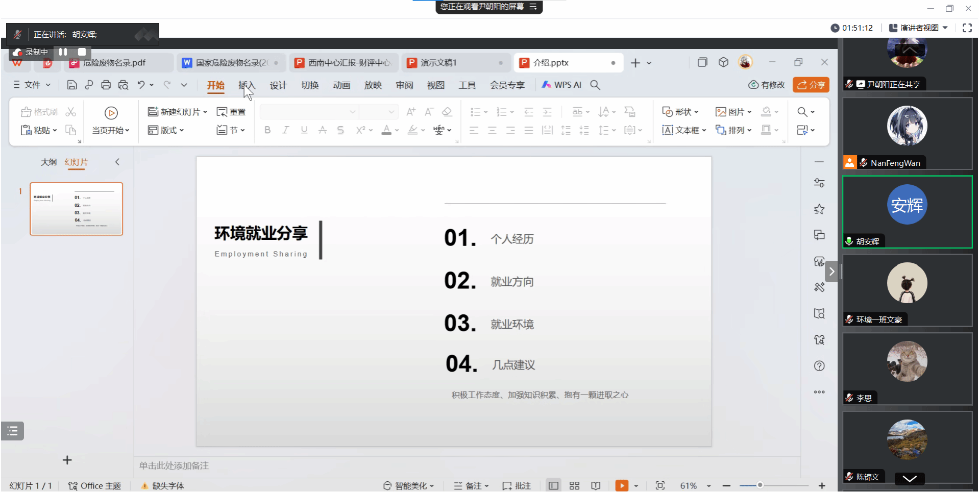 第三位分享的是尹朝阳。尹朝阳2008年就读于西南交通大学,现就职于四川省生态环境科学研究院,任固体所副所长。尹朝阳学长从环境学科就业方向的角度出发,为同学们分析了各个职业选择的优势,帮助同学们梳理不同职业的工作内容和所需要的条件,分享他在就业时的经验和想法。他特别强调了同学们要发挥学习的主观能动性,培养终身学习的观念,主动积极学习行业最新的政策和方法,紧跟国家发展步伐,以此来提高职场竞争力。