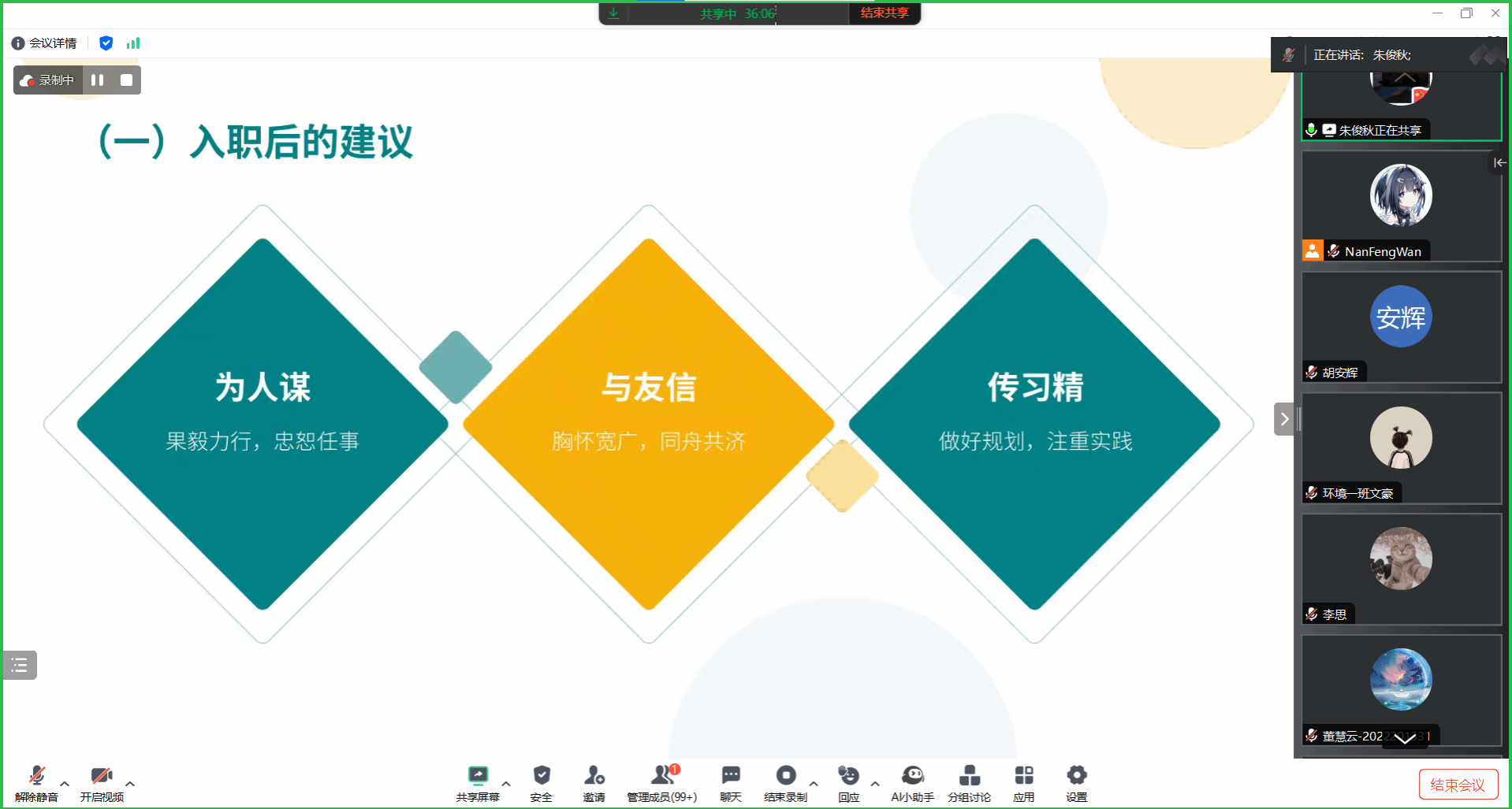 第一位分享的是朱俊秋。朱俊秋2000年本科就读于西南交通大学,现任四川省冶勘设计集团生态环境工程有限公司副总经理。朱俊秋学长从就业方向、专业类型、就业形势等方面展开分享,详细分析了现阶段环境行业的良好发展势头和前景,并向同学们提出了以下三点期望:为人谋,要果毅力行、忠恕任事;与友信,要胸怀宽广、同舟共济;传习精,要做好规划、注重实践。