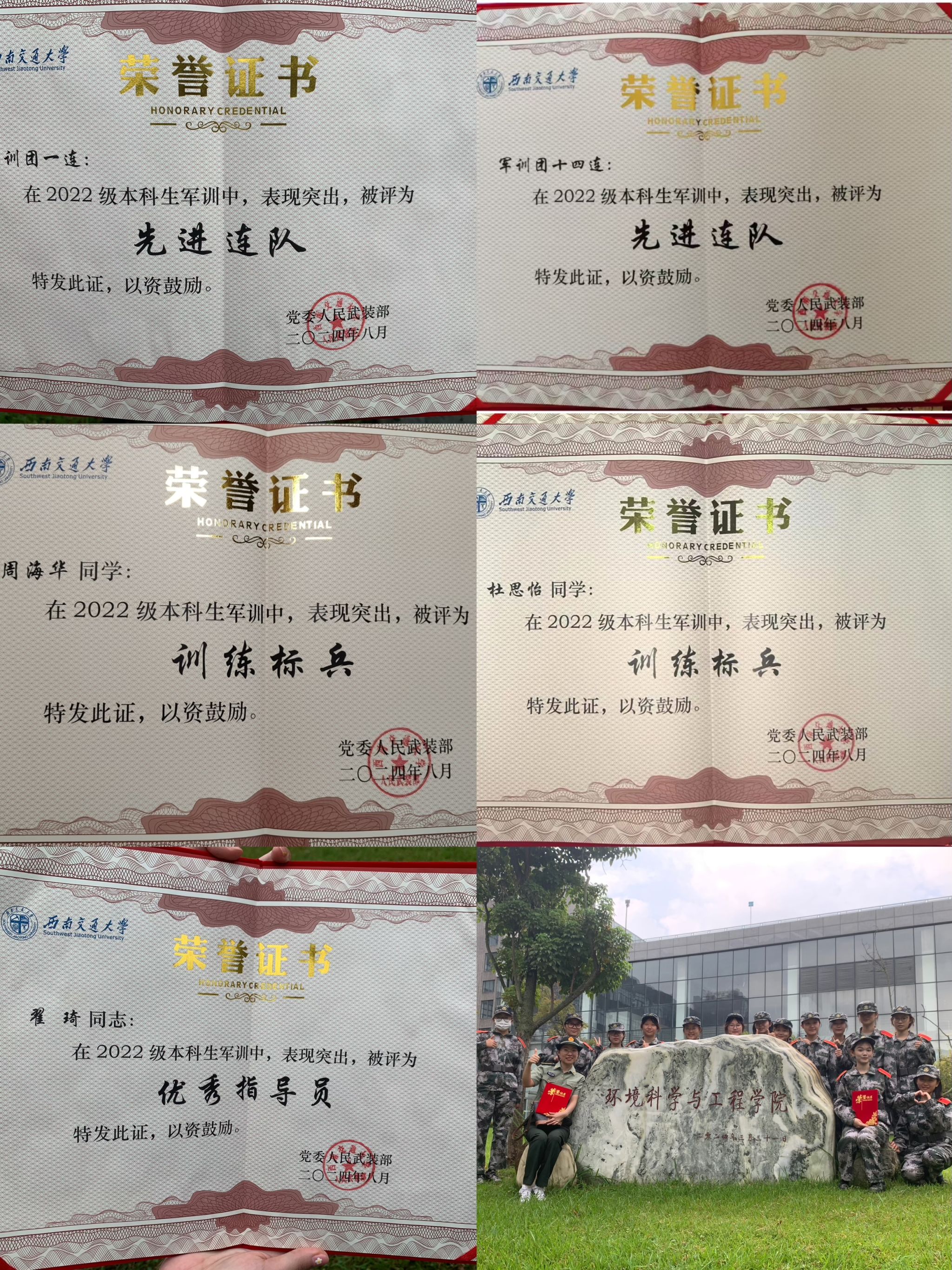 女生所编入的一连队和男生所编入的十四连队均评为优秀连队,环境学子杜思怡同学、周海华同学均评为训练标兵,一连队指导员翟琦评为优秀指导员。