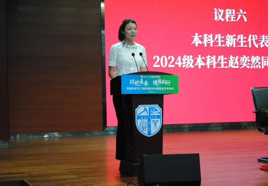 的激动、对环境专业的热爱、对大学生活的期待和对未来的憧憬。她代表全体2024级本科新生庄严承诺,将珍惜在交大的学习机会,追求卓越,为推进人与自然和谐共生的现代化建设贡献青春力量。