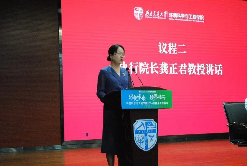 执行院长龚正君教授,副院长张涵教授,副院长赵锐教授,校友代表、四川省工业环境监测研究院张亚会高工,院长助理王冬梅高级工程师,教师代表曾卓老师、辅导员老师、2024级班导师以及151名本科生和91名研究生新生参与本次开学典礼。典礼由院党委副书记胡安辉主持。