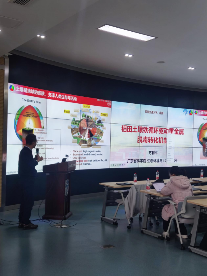 方利平研究员围绕“稻田土壤中铁循环驱动的重金属脱毒与转化机制”这一主题,详尽介绍了其团队近年来在该领域内所开展的一系列深入研究工作。当前,我国耕地土壤重金属污染问题形势严峻,其中,稻田土壤的重金属污染尤为突出,成为亟待解决的关键问题。鉴于稻米在我国作为首要粮食作物的重要地位,且我国约85%的稻田分布于红壤区域,该区域土壤因遭受强烈的自然风化与淋溶作用,导致重金属元素活性增强,进一步加剧了污染问题。针对上述严峻的科学挑战,方利平研究员将研究重心聚焦于稻田土壤,致力于探索稻田土壤重金属污染治理的基础理论与技术创新,以及Fe(Ⅱ)/Fe(Ⅲ)氧化还原电位与重金属形态转化的高度耦合性,逐步将红壤中铁循环及其环境效应确立为核心科学议题。通过深入剖析铁循环对重金属迁移转化的驱动作用,方老师开辟了一条土壤重金属污染治理的新路径,提出新颖的理论框架、科学见解与技术方案。方老师的讲解深入浅出,不仅展示了其团队在该领域的深厚积累与独到见解,更激发了现场师生的广泛兴趣与热烈讨论。