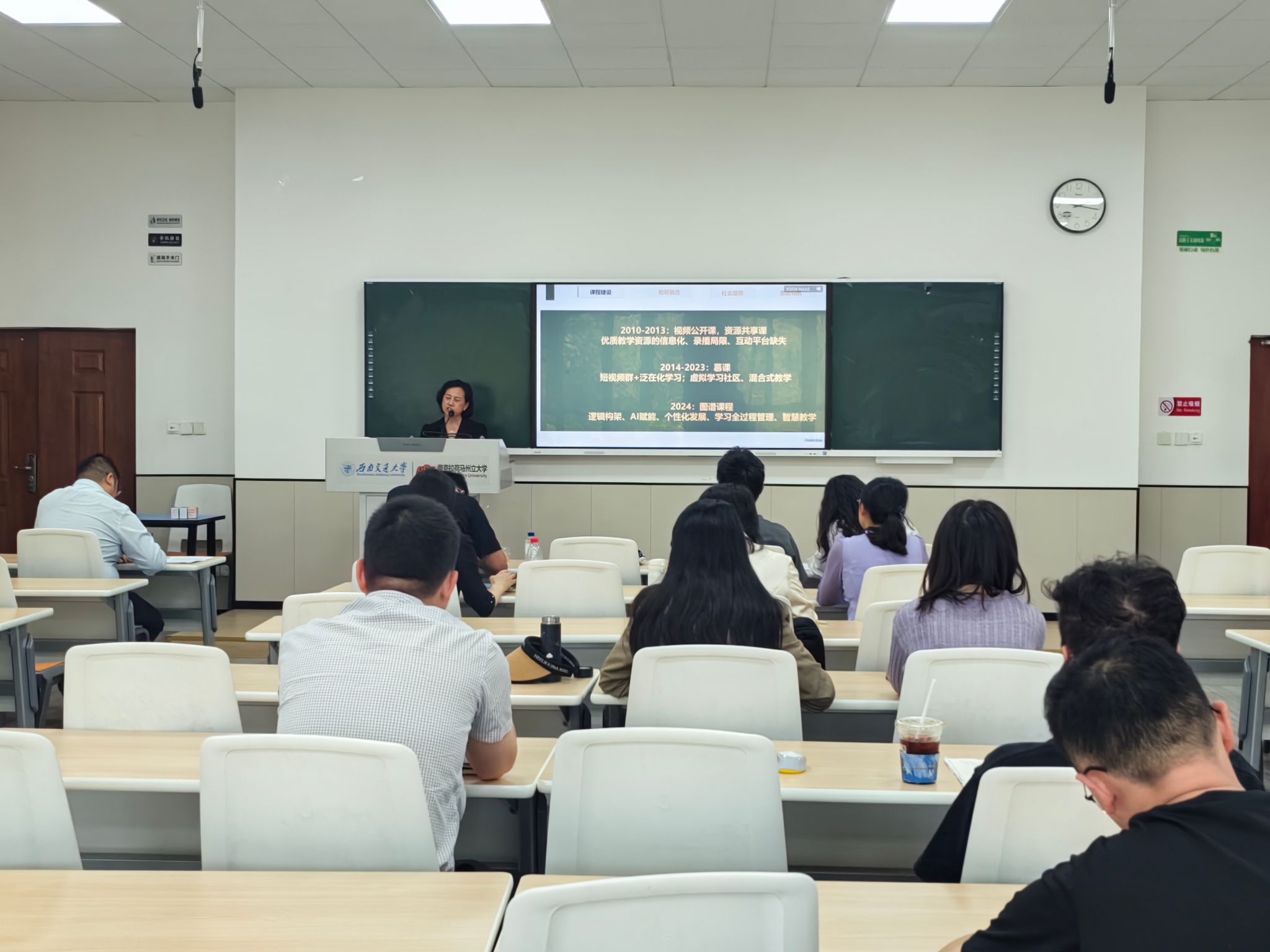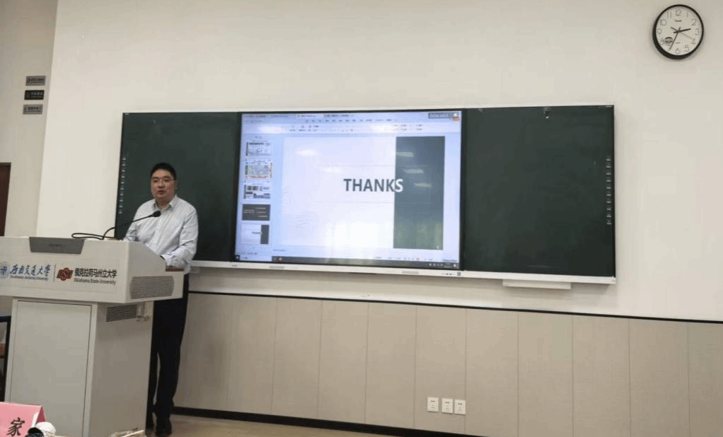 李成坚教授以《一位高校教师的成长之路:从跟随到引领》为题,从课程建设、教研融合、社会服务、思政领航四个维度开展分享。她提出,高校教师的成长需突破跟随者思维,在教学实践中构建引领者格局。李成坚教授深情诠释了教师的“情怀与担当”,特别强调党建引领是教学创新的根本方向,将思政元素有机融入专业教学,体现“跨文化传播”的时代使命;探索“产教融合新范式”,将语言教学与地方文化传播、产业需求紧密结合,形成示范推广效应;提出以“三星堆”“熊猫文化”等四川特色文化IP为载体,打造兼具中国气派与交大特色的跨文化通识课程,培养“会讲中国故事”的国际化人才。
