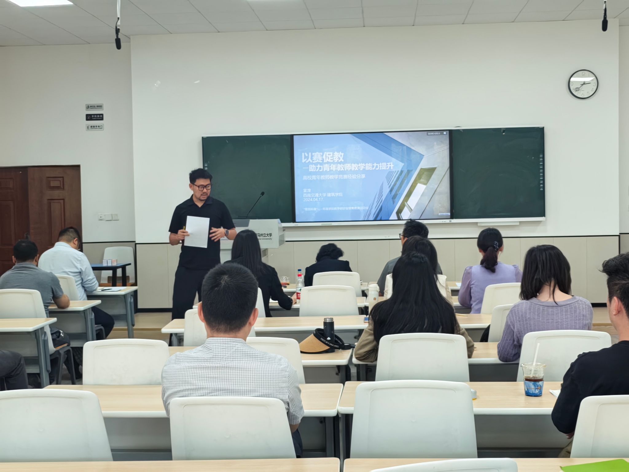 青年教师代表宣湟副教授以“以赛促教助力教学能力提升”为核心,结合环境学科特色,分享了教学竞赛与日常教学的融合之道。他提出,教学竞赛不仅是检验教学水平的“试金石”,更是更新教学理念、创新教学方法的“助推器”,青年教师应借此平台锤炼教学技艺,实现从“站稳讲台”到“站好讲台”的跨越。宣湟老师特别强调,教师对教育的热爱要转化为对学生的深层关怀——不仅是成为学生知识的传递者,更要成为学生价值观塑造的引路人,要坚持用有温度、有热情的教学创造“让学生终身铭记的课堂体验”。
