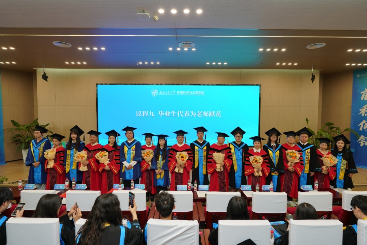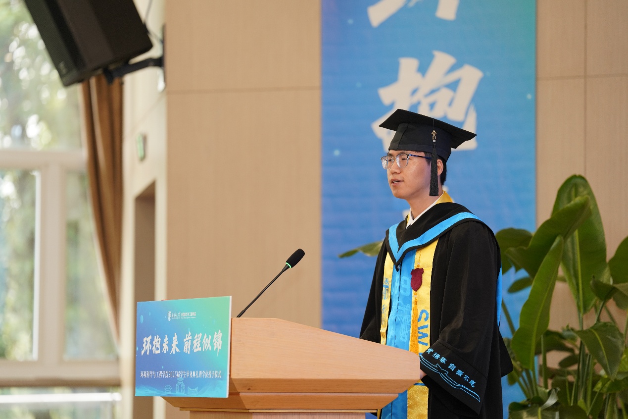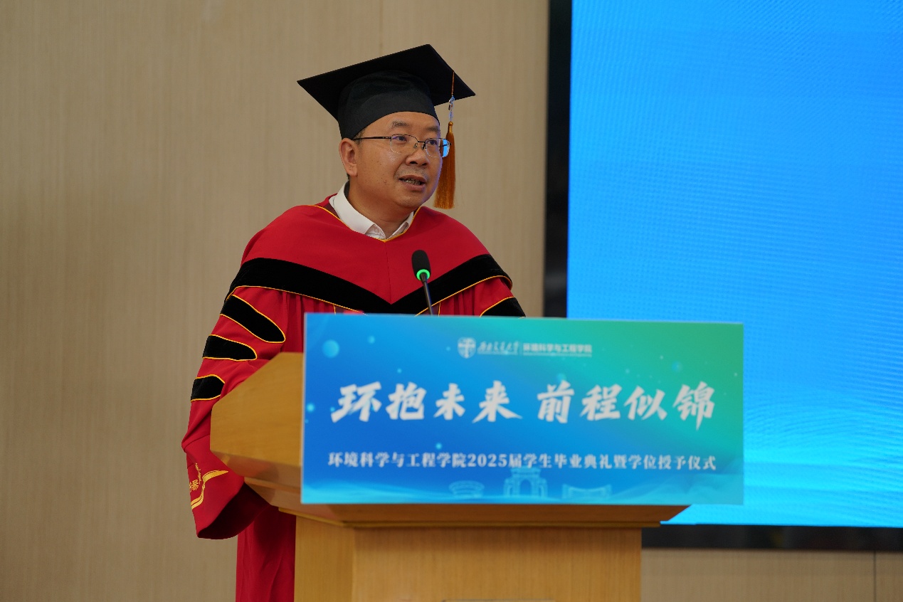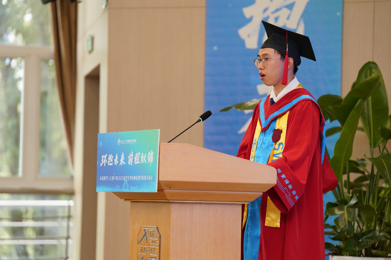 各位老师的辛勤栽培,并回望四年间课堂求知的凝神专注、专业实验的技能淬炼、与同窗并肩的成长轨迹。他呼吁全体毕业生携“竢实扬华,自强不息”的交大精神,在深造科研或服务社会的不同路径上,以“美丽中国奋斗有我”的信念浇灌青春理想,让交大环境人的担当在绿色发展征程中绽放光芒。