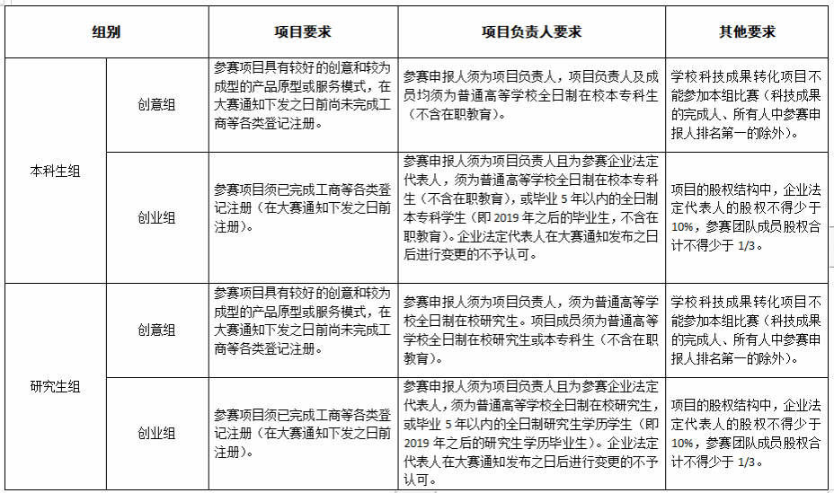 3.参赛申报人须为项目负责人,须为普通高等学校全日制在校生(包括本专科生、研究生,不含在职教育),或毕业5年以内的全日制学生(即2019年之后的毕业生,不含在职教育);国家开放大学学生(仅限学历教育)。企业法定代表人在大赛通知发布之日后进行变更的不予认可。