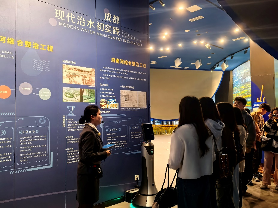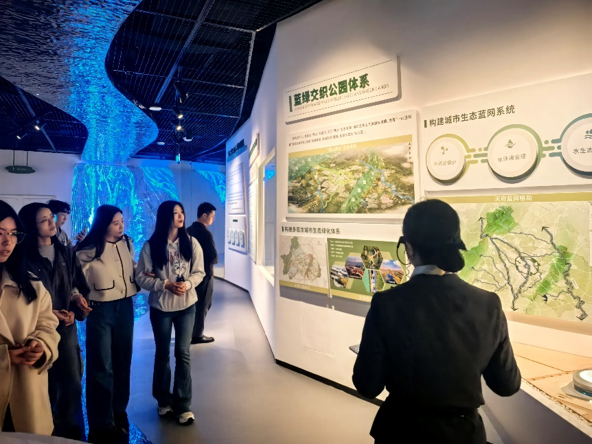 随后,支部成员步入水文化博物馆——初心馆进行参观学习。初心馆以其独特的圆弧形设计,融合了蓝绿二色作为主基调,以呼应成都市蓝绿相融的“天府蓝网”规划理念。展馆以治水为主线,通过“天人合一 水造天府”、“治蓉兴蓉 其枢在水”、“天府蓝网 沱江实践”、“滴水之识 美丽新篇”四大篇章,生动再现了蜀地治水的悠久历史,深入讲述了蜀水的奥秘与天府治水的历程,揭示了成都市致力于打造清澈可触的生态基脉、蓝绿一体的活力动脉和价值彰显的发展兴脉的坚定决心与显著成效。