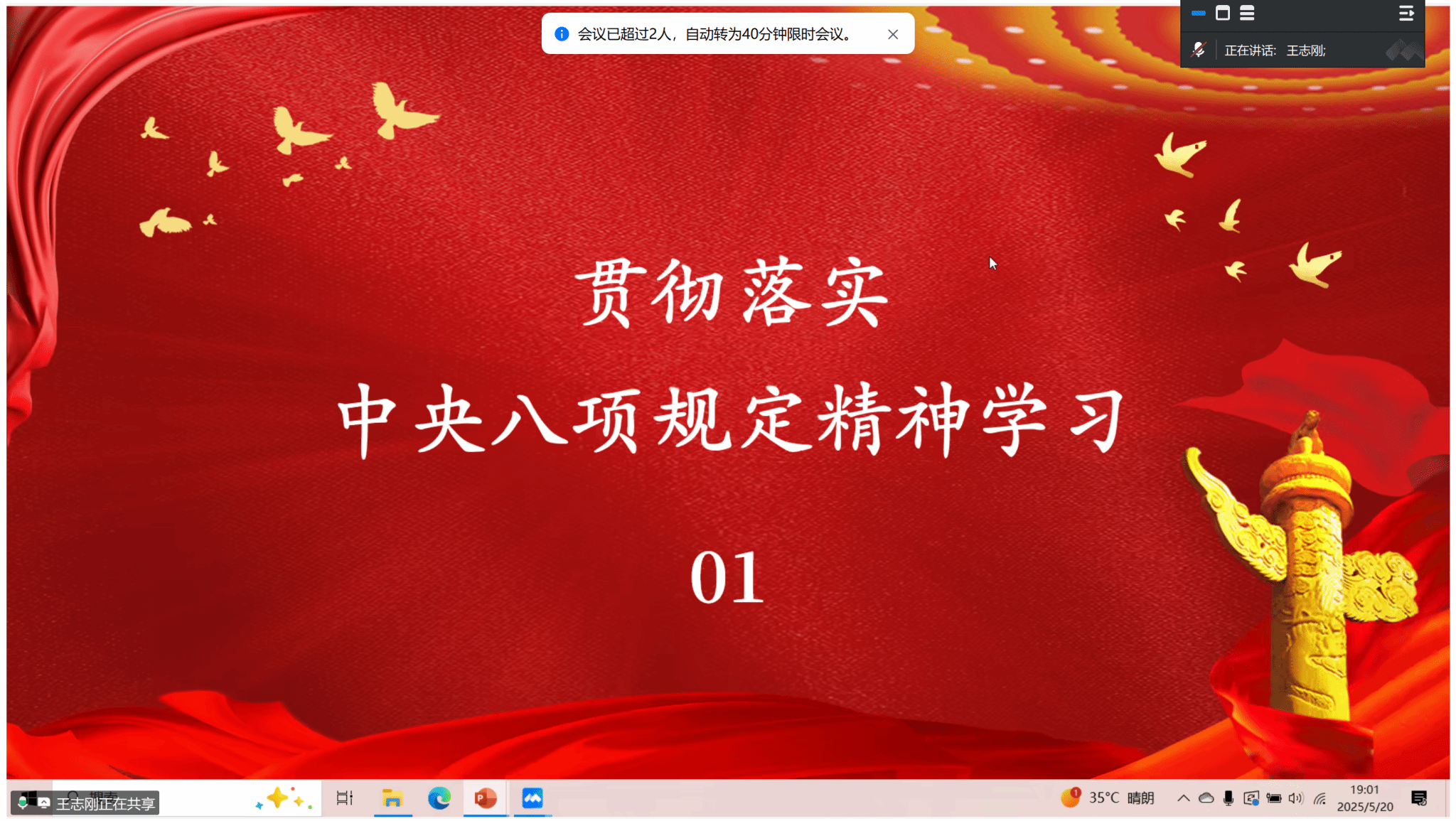 硕士第五党支部于5月20日19:00在腾讯会议开展5月主题党日活动,主要目的是学习中央八项规定精神,一体推进党风政风、师德师风、校风学风建设。本次活动的领学人为王志刚、张蕾和田中玉同志。