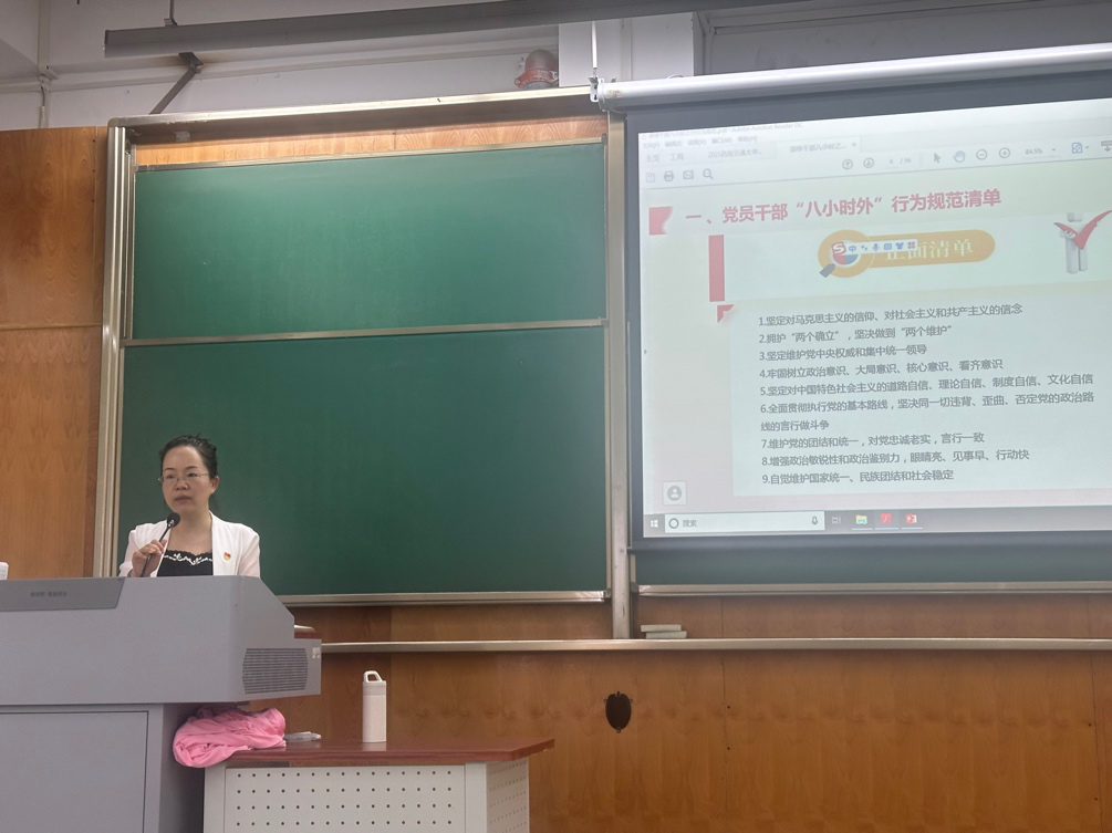在专题讲授后,龚院长还带领全体党员集中学习了《党员干部“八小时外”行为规范清单》,进一步强调党员在“工作之外”的时间也必须时刻绷紧纪律规矩这根弦,做到“八小时之内讲规矩,八小时之外守底线”,确保党员身份时时在线、处处可见。