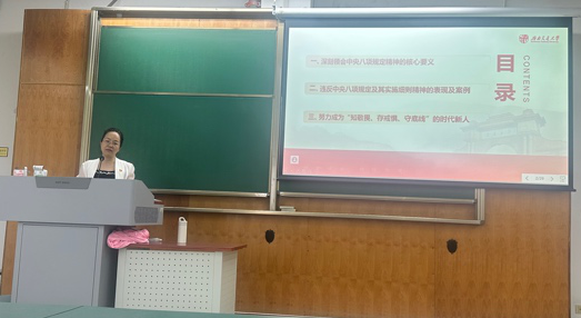 本次党课以“深入贯彻中央八项规定精神学习教育”为主题,龚正君院长围绕“三个方面”展开了深入解读。一是深刻领会中央八项规定精神的核心要义。龚院长从中央八项规定出台的背景、主要内容和深远意义讲起,强调其作为改进作风、密切党群关系的制度保障,是我们党全面从严治党的重要抓手,是新时代党员干部必须牢牢把握的政治纪律和政治规矩。二是剖析违反八项规定及其实施细则的具体表现与典型案例,通过一系列鲜活的反面事例,使全体党员直观感受到“四风”问题的顽固性和反复性,警醒党员干部必须警钟长鸣,坚决防止“节日腐败”“隐形变异”等问题反弹回潮。三是号召全体党员努力成为“知敬畏、存戒惧、守底线”的时代新人,在大是大非面前保持清醒头脑,在小事小节中检视初心使命,不断提升政治判断力、政治领悟力和政治执行力。