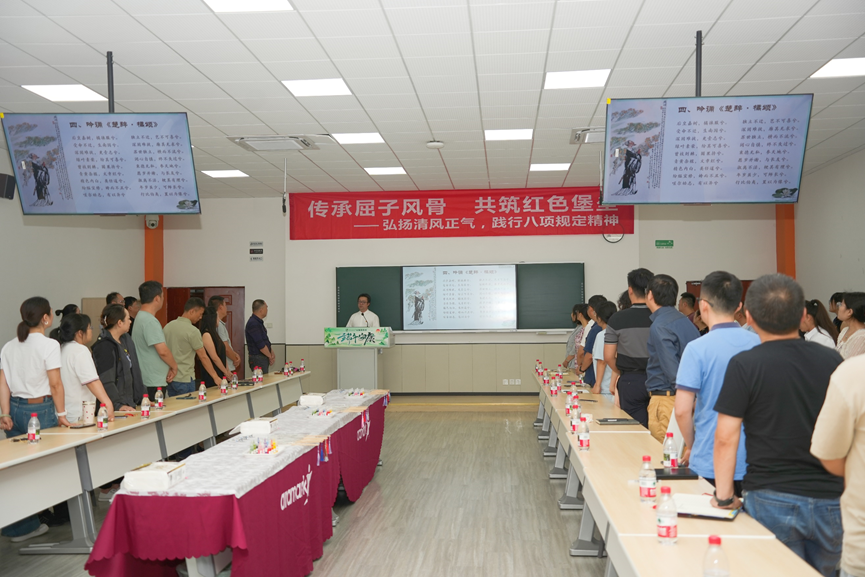 党课尾声,甘霖带领全体党员齐诵《橘颂》,在深沉浑厚的吟诵声中,党员们深刻体悟到屈原精神与当代党员干部践行中央八项规定精神的内在共鸣。