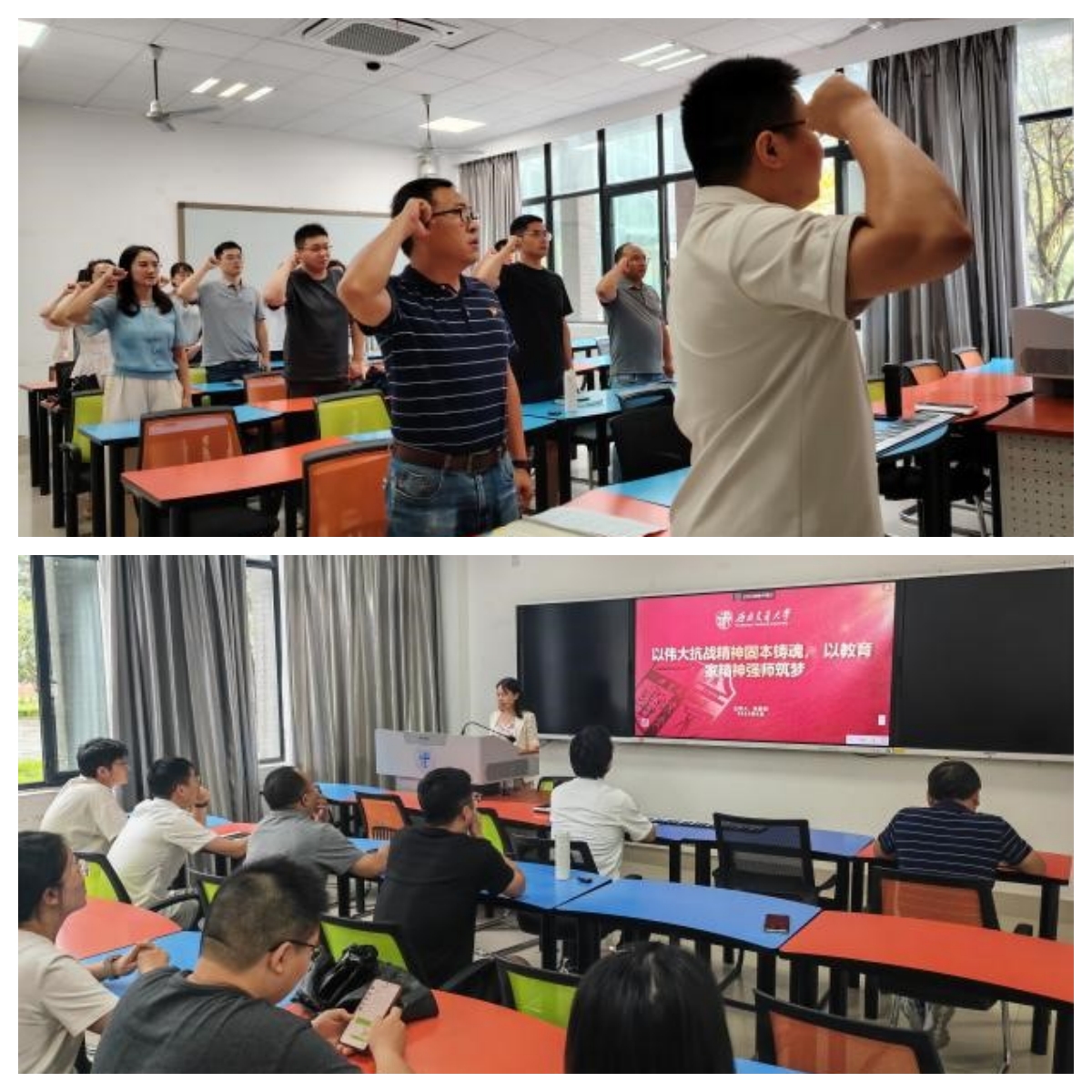 然后,第二党支部书记张胜利同志以“以伟大抗战精神固本铸魂,以教育家精神强师筑梦”为主题,为两个支部的全体党员讲专题党课。张胜利同志结合习近平总书记在纪念中国人民抗日战争暨世界反法西斯战争胜利80周年大会上的重要讲话视频,讲解了中国抗战在世界反法西斯战争中的历史地位、中华民族伟大复兴的历史必然性,呼吁全体党员同志要铭记历史、缅怀先烈、传承和弘扬伟大抗战精神,为民族复兴伟业团结奋斗。在“以教育家精神强师筑梦”部分,张胜利同志重点介绍了2025年全国“最美教师”入选者、我校首席教授、中国科新葡京博彩官网