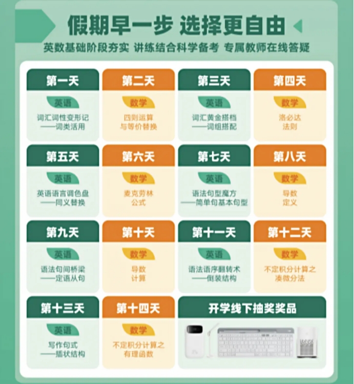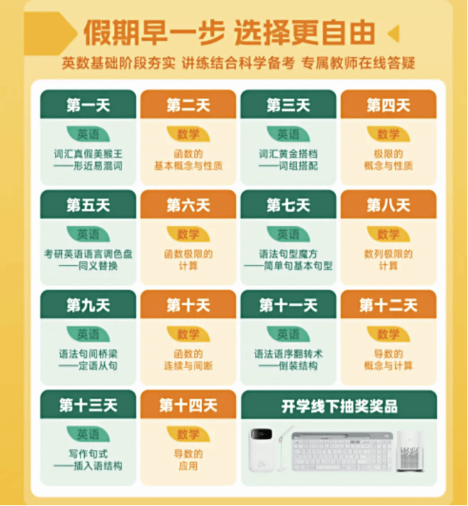 现拟开展2025寒假新质学习力提升系列活动,本次活动组织了“考研寒假打卡营”、“考研线上一对一咨询”、“深造规划系列课”、“寒假8天英语提升打卡营”、“英语提升1V1规划咨询”等五项优质学习内容,具体通知如下: