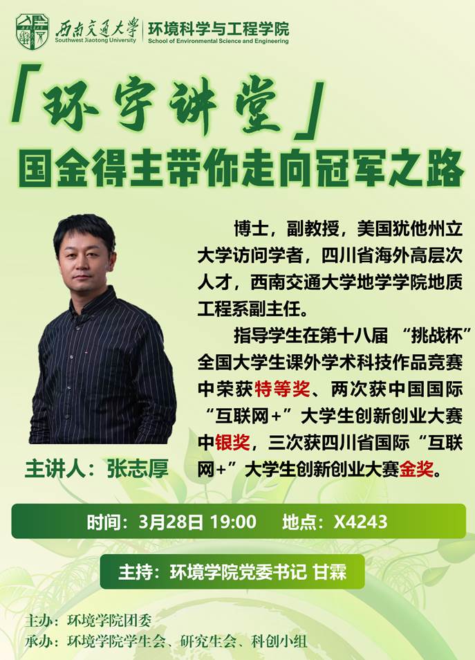 为激发学生创新潜能,培养创业实践能力,营造校园创新创业氛围,特开展本次“环宇讲堂——国金得主带你走向成功之路”活动。